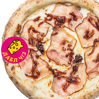 Бекон, моцарелла, карамелизированный лук, сливки и чесночное масло.